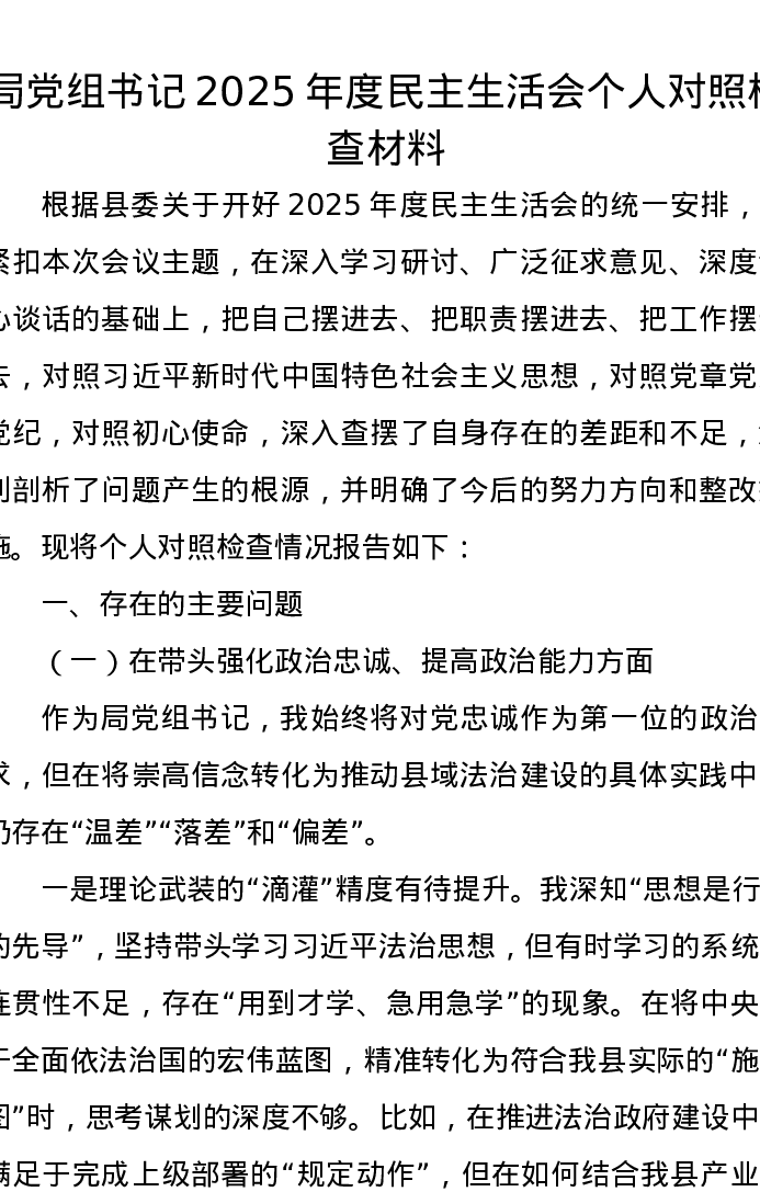 局党组书记2025年度xxxxx个人对照检查材料(五个带头)
