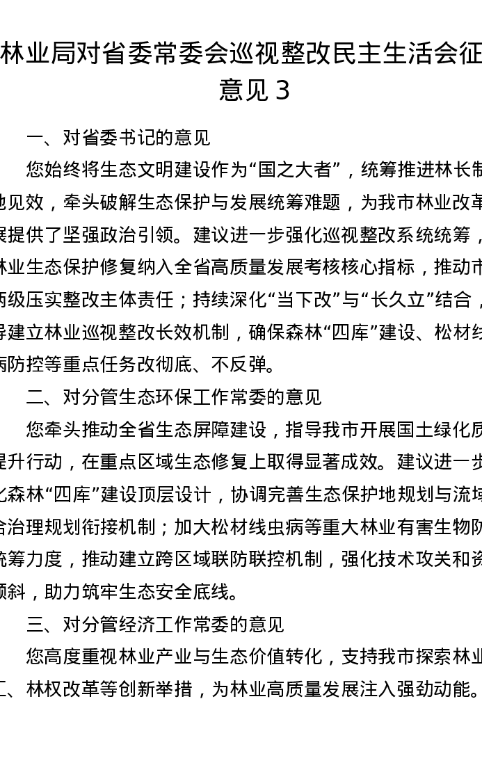 林业局对省委常委会巡视整改xxxxx征求意见3