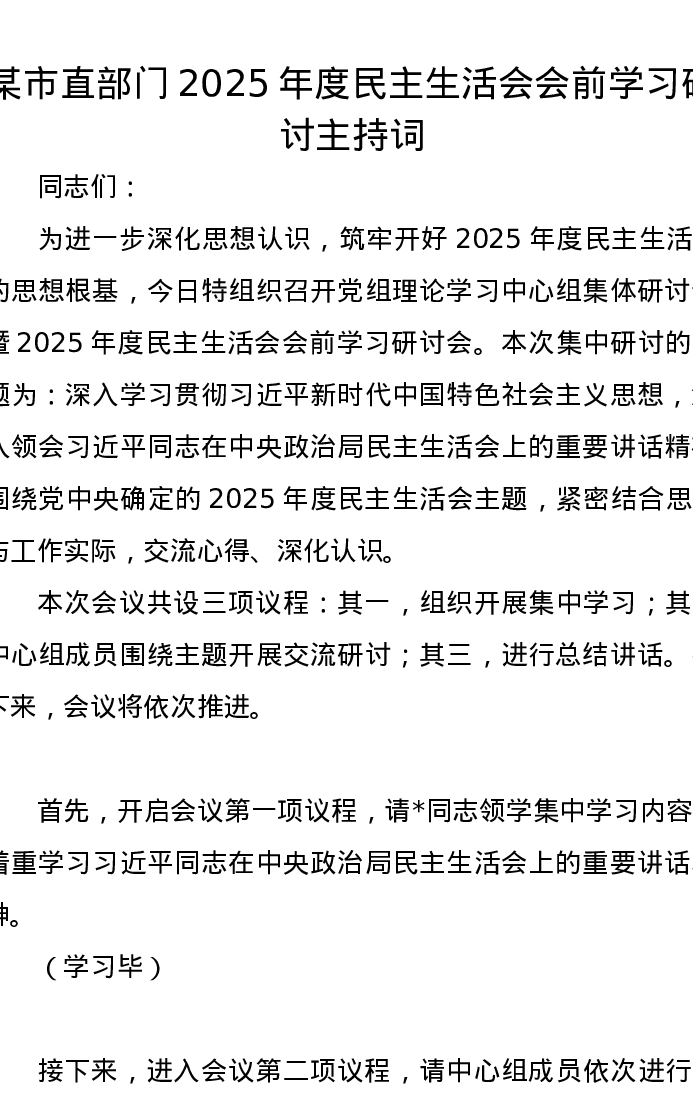 某市直部门2025年度xxxxx会前学习研讨主持词(五个带头)