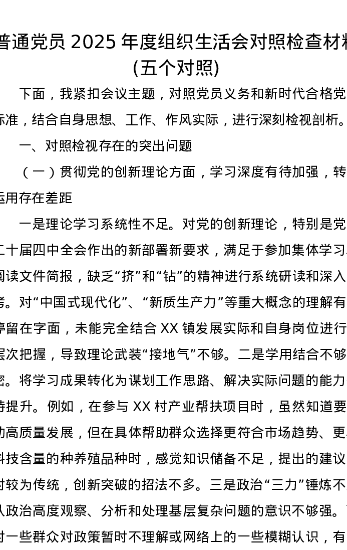 普通党员2025年度组织xxx对照检查材料(五个对照)