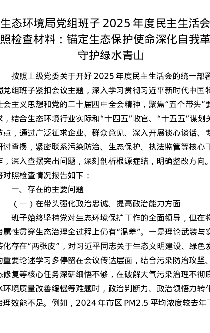 生态环境局党组班子2025年度五个带头xxxxx对照检查材料:锚定生态保护使命 深化自我革命 守护绿水青山