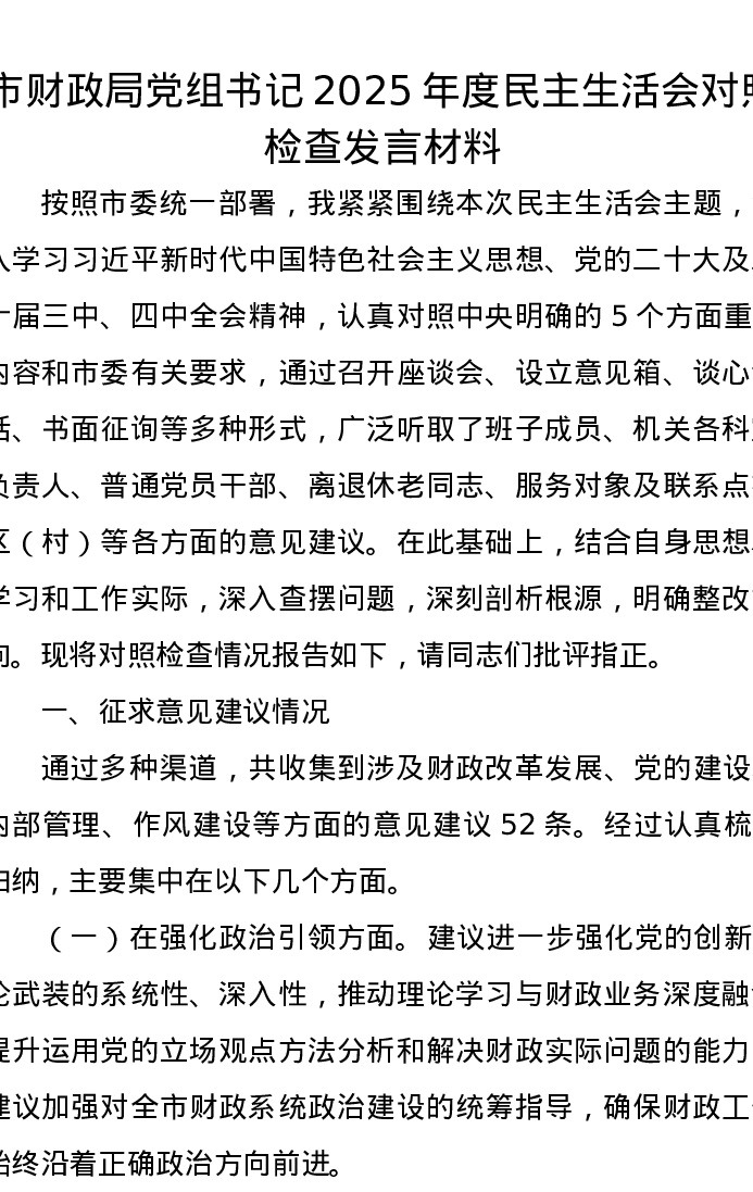 市财政局党组书记2025年度xxxxx对照检查发言材料(五个带头)