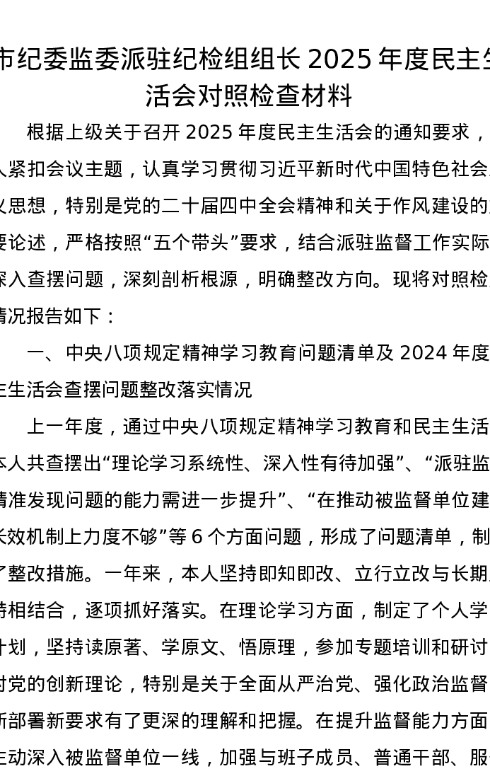 市纪委监委派驻纪检组组长2025年度xxxxx对照检查材料(五个带头)