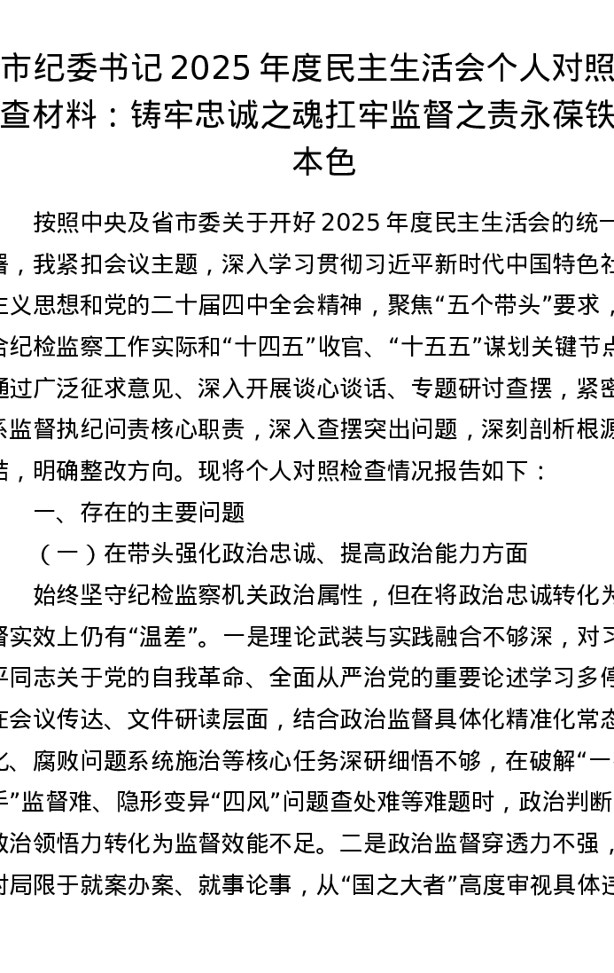 市纪委书记2025年度xxxxx个人对照检查材料:铸牢忠诚之魂 扛牢监督之责 永葆铁军本色(五个带头)