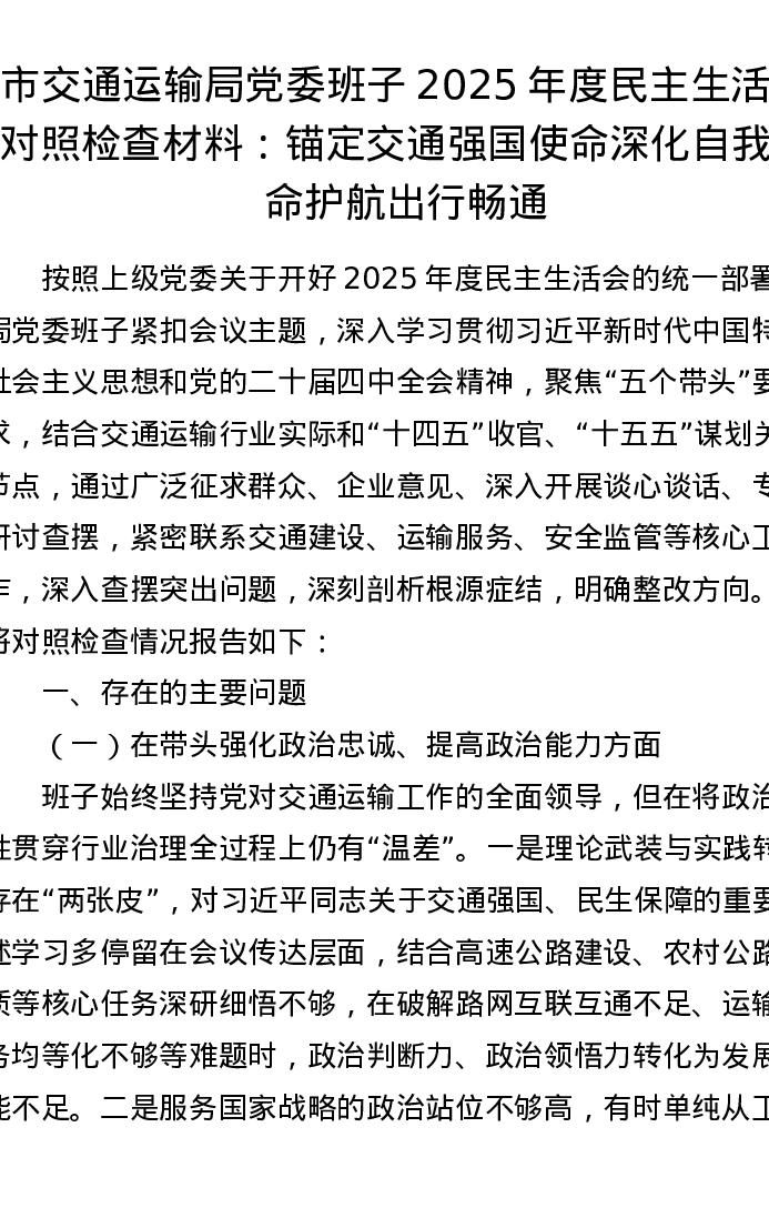 市交通运输局党委班子2025年度五个带头xxxxx对照检查材料:锚定交通强国使命 深化自我革命 护航出行畅通