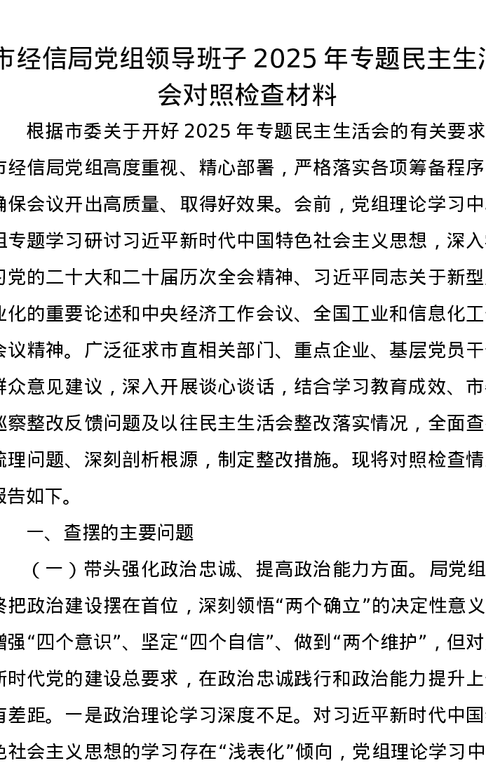 市经信局党组领导班子2025年专题xxxxx对照检查材料(五个带头)