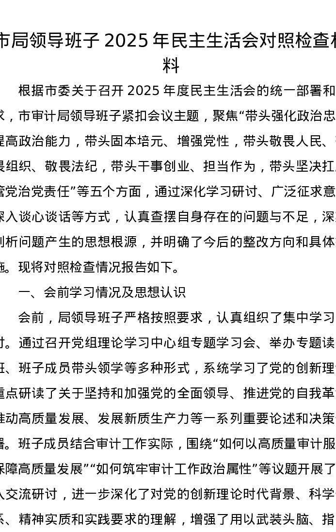 市局领导班子2025年xxxxx对照检查材料(五个带头)