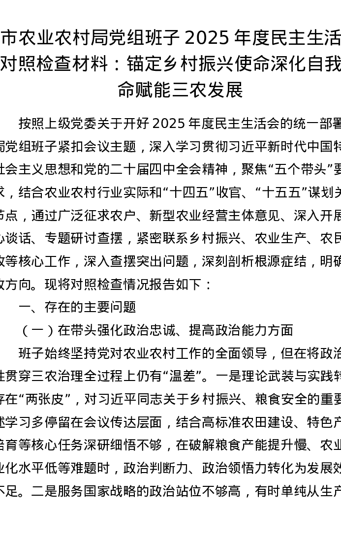 市农业农村局党组班子2025年度五个带头xxxxx对照检查材料:锚定乡村振兴使命 深化自我革命 赋能三农发展