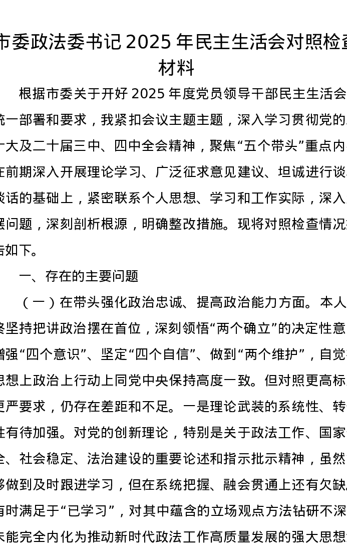 市委政法委书记2025年xxxxx对照检查材料(五个带头)