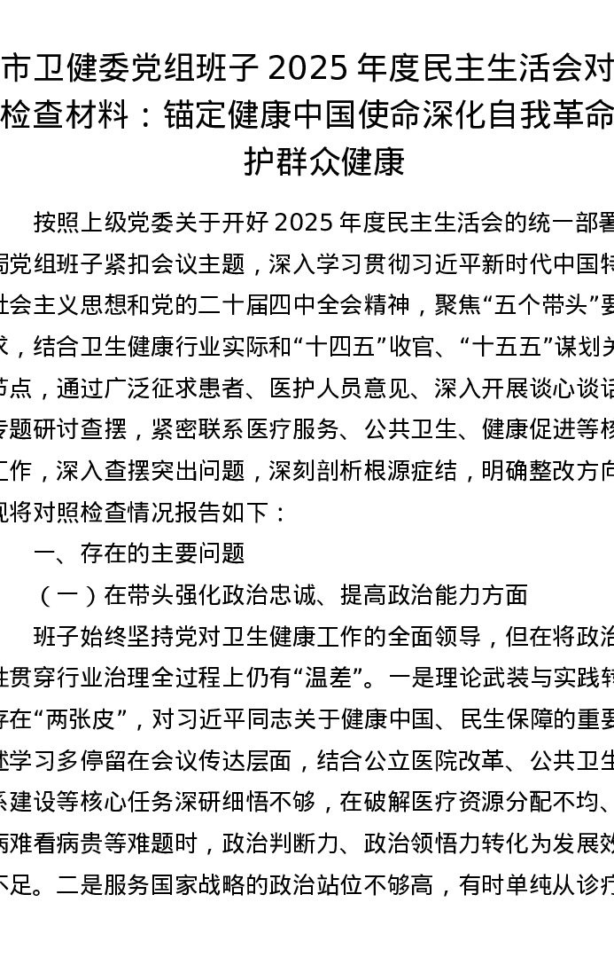 市卫健委党组班子2025年度五个带头xxxxx对照检查材料:锚定健康中国使命 深化自我革命 守护群众健康