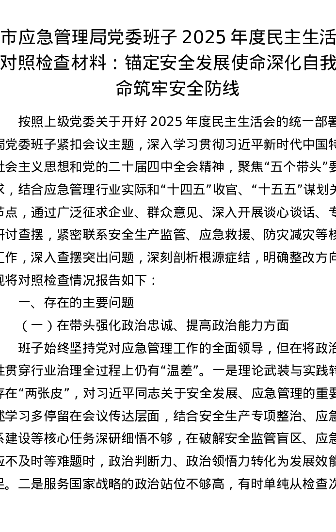 市应急管理局党委班子2025年度五个带头xxxxx对照检查材料:锚定安全发展使命 深化自我革命 筑牢安全防线