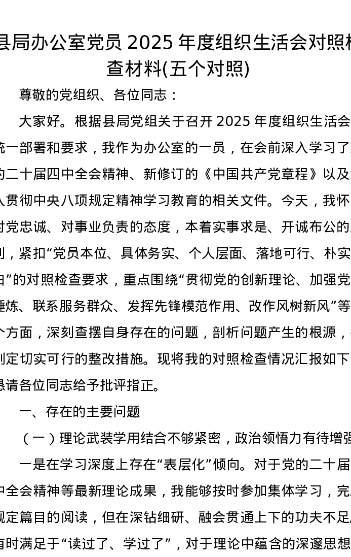 县局办公室党员2025年度组织xxx对照检查材料(五个对照)