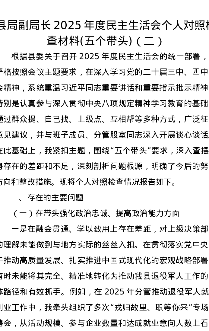 县局副局长2025年度xxxxx个人对照检查材料(五个带头)(二)