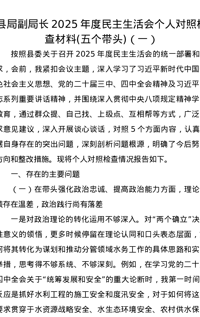 县局副局长2025年度xxxxx个人对照检查材料(五个带头)(一)