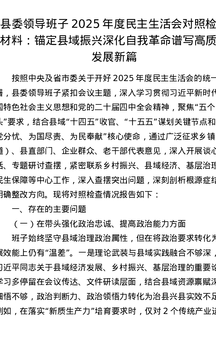 县委领导班子2025年度五个带头xxxxx对照检查材料:锚定县域振兴 深化自我革命 谱写高质量发展新篇
