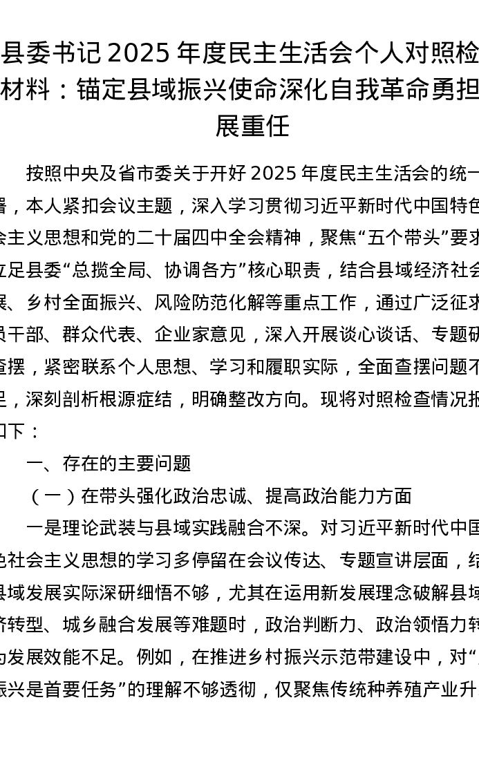 县委书记2025年度xxxxx个人对照检查材料:锚定县域振兴使命 深化自我革命 勇担发展重任(五个带头)