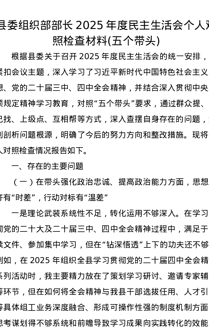 县委组织部部长2025年度xxxxx个人对照检查材料(五个带头)
