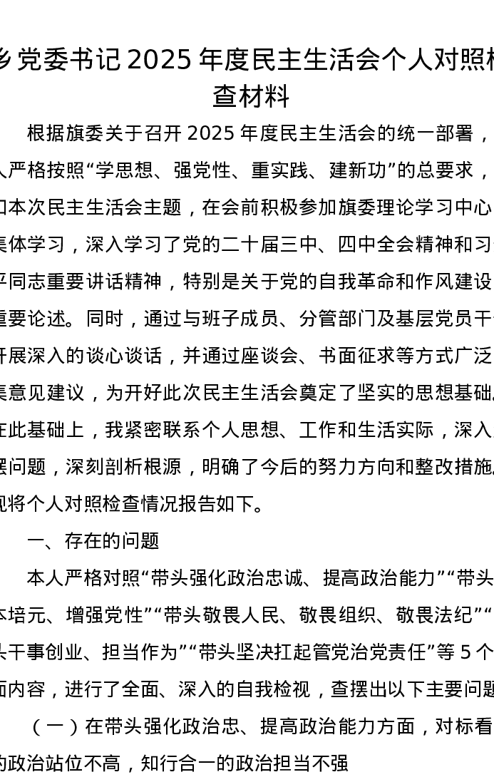 乡党委书记2025年度xxxxx个人对照检查材料(五个带头)