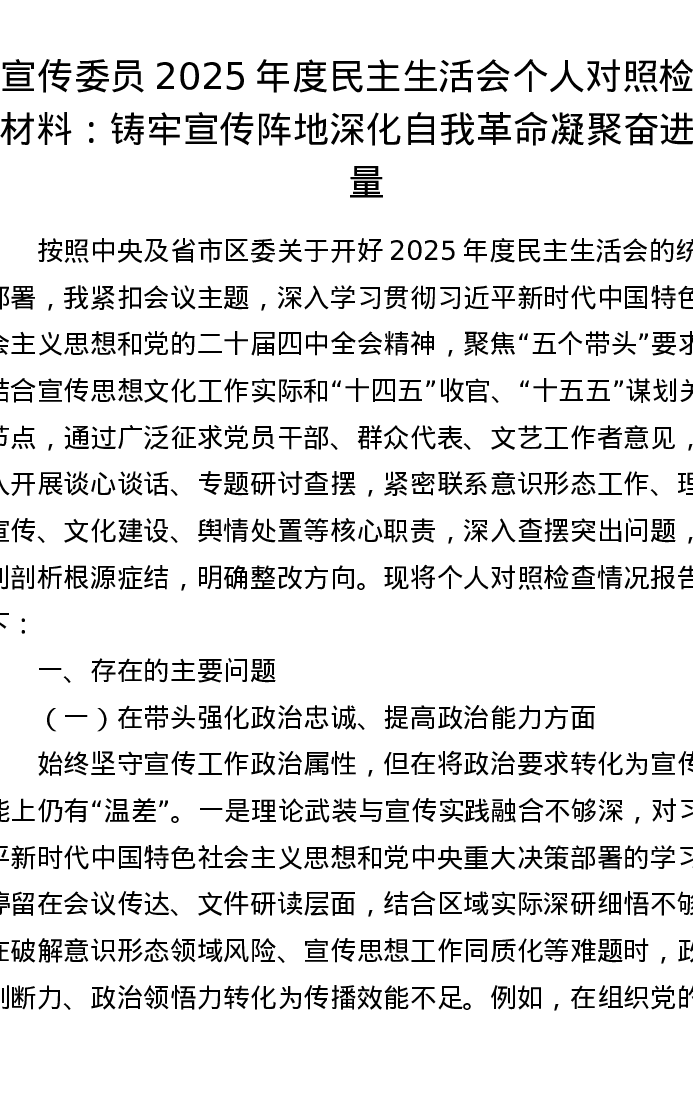 宣传委员2025年度五个带头xxxxx个人对照检查材料:铸牢宣传阵地 深化自我革命 凝聚奋进力量