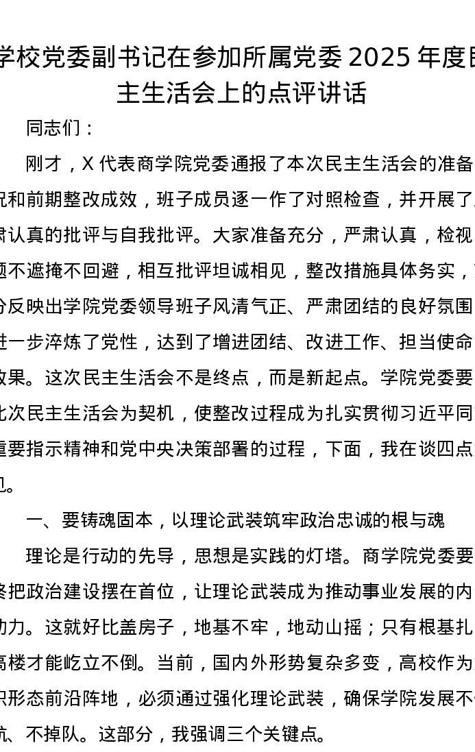 学校党委副书记在参加所属党委2025年度xxxxx上的点评讲话(五个带头)