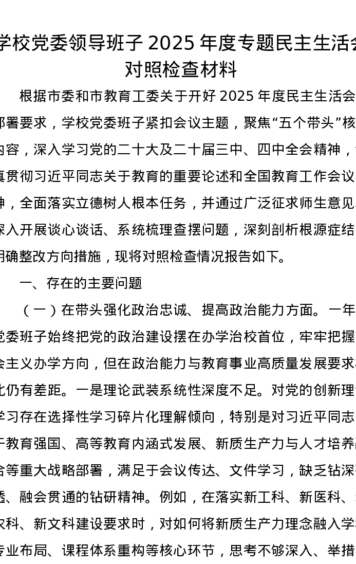 学校党委领导班子2025年度专题xxxxx对照检查材料(五个带头)