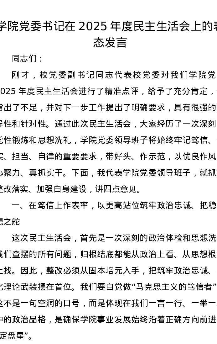 学院党委书记在2025年度xxxxx上的表态发言(五个带头)