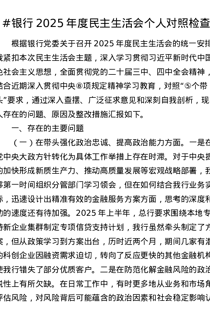 银行2025年度xxxxx个人对照检查2(五个带头)