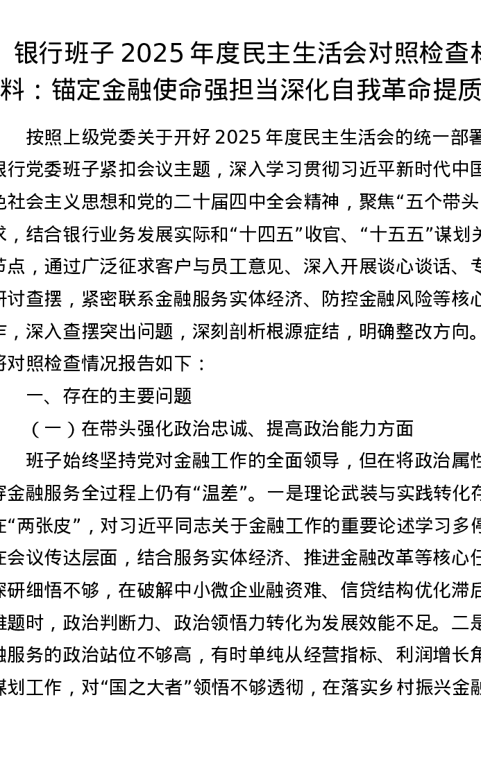 银行党委班子2025年度五个带头xxxxx对照检查材料:锚定金融使命强担当 深化自我革命提质效
