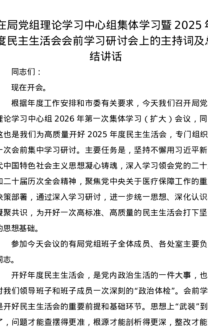 在局党组理论学习中心组集体学习暨2025年度xxxxx会前学习研讨会上的主持词及总结讲话(五个带头)