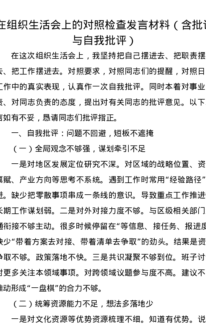 在组织xxx上的对照检查发言材料(含批评与自我批评)