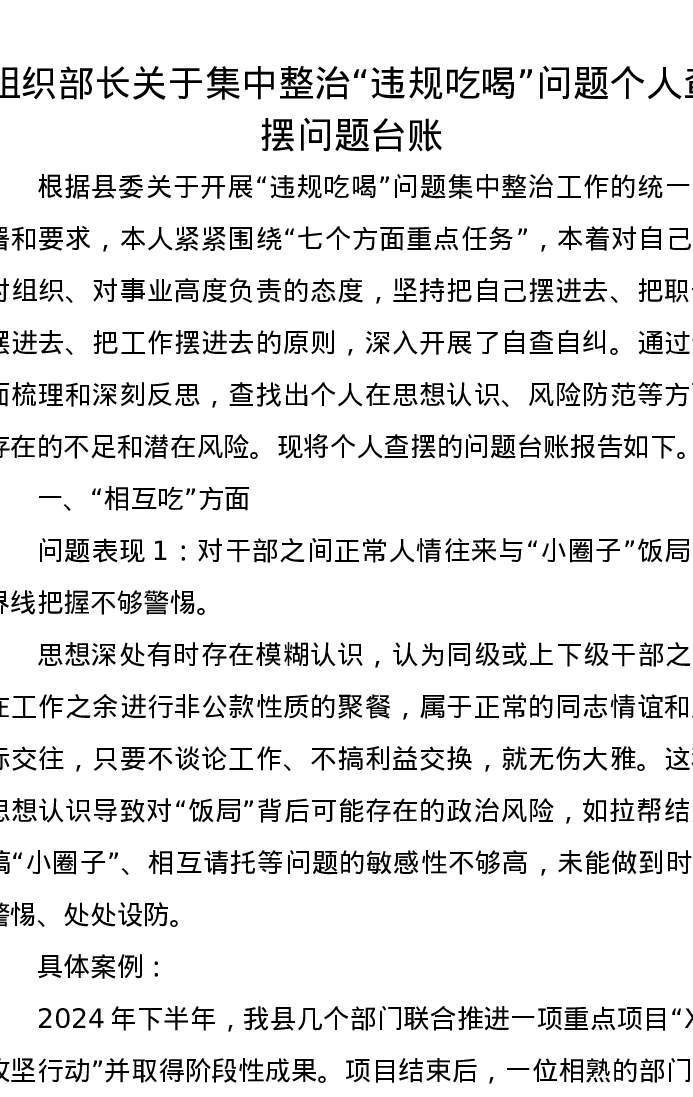 组织部长关于集中整治违规吃喝问题个人查摆问题台账