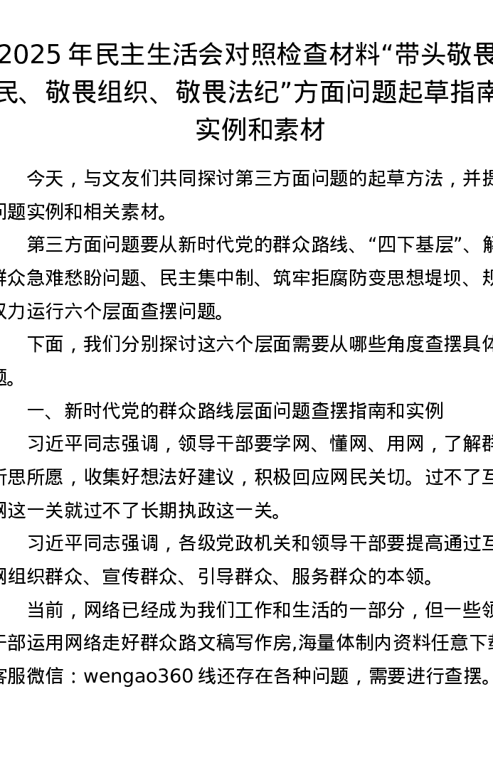 (157条)2025年xxxxx对照检查材料带头敬畏人民、敬畏组织、敬畏法纪方面问题起草指南、实例和素材