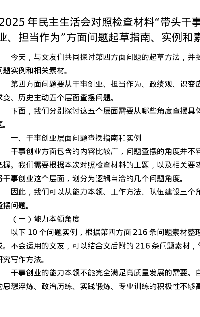 (216条)2025年xxxxx对照检查材料带头干事创业、担当作为方面问题起草指南、实例和素材