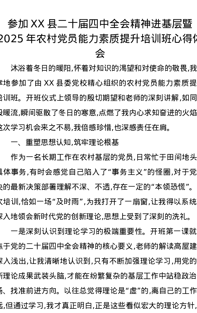 参加XX县二十届四中全会精神进基层暨2025年农村党员能力素质提升培训班心得体会