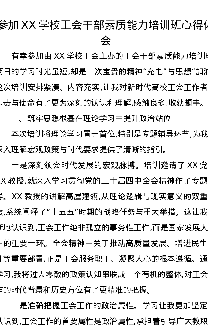 参加XX学校工会干部素质能力培训班心得体会