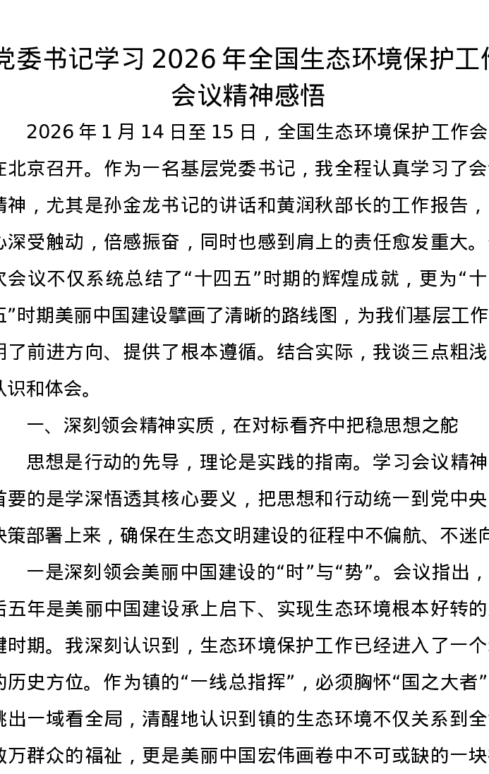 党委书记学习2026年全国生态环境保护工作会议精神感悟心得