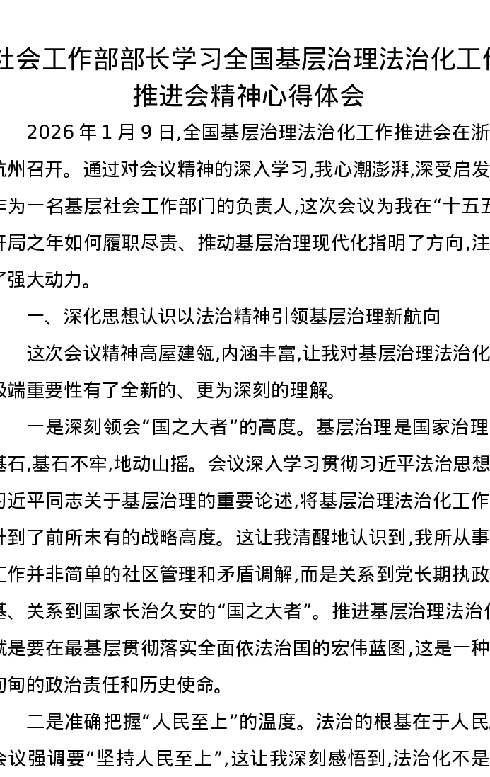 社会工作部部长学习全国基层治理法治化工作推进会精神心得体会