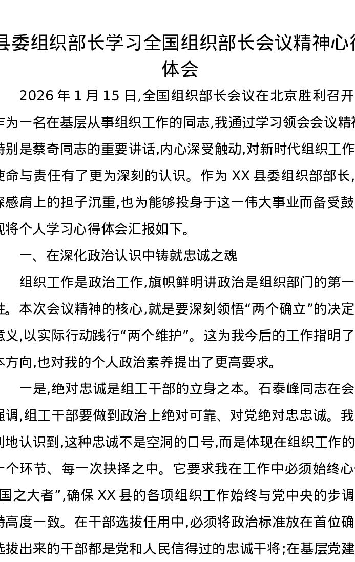 县委组织部长学习全国组织部长会议精神心得体会