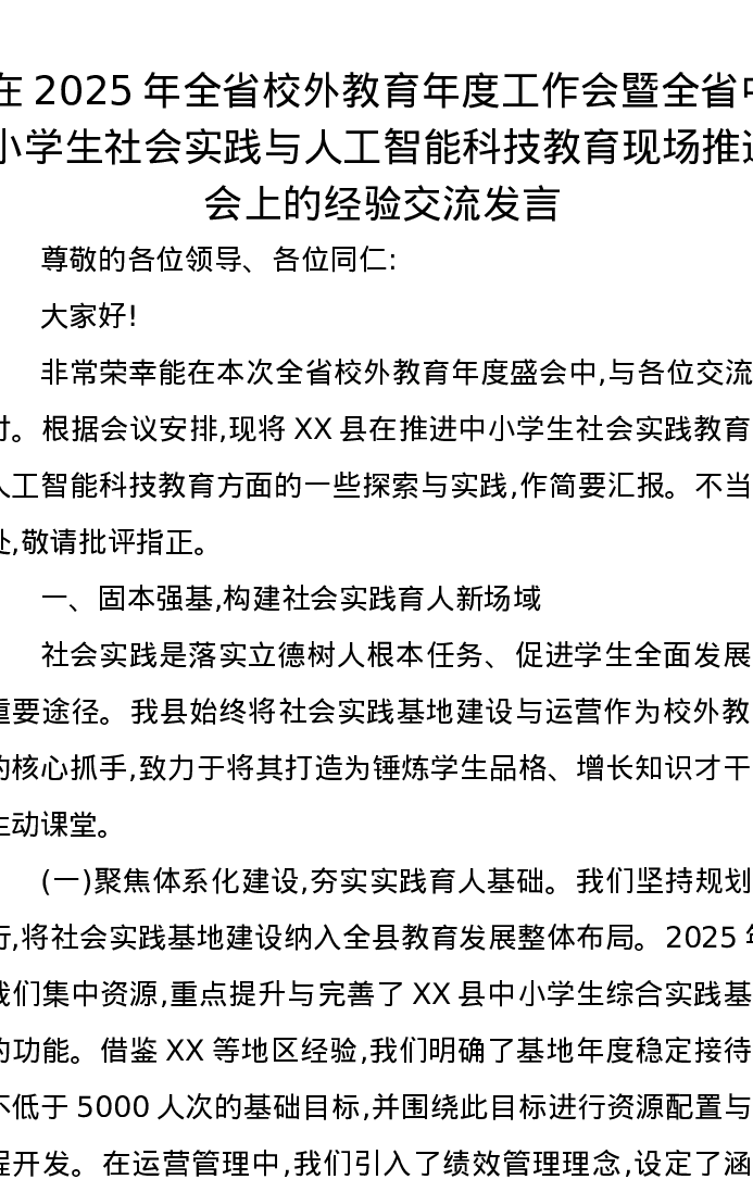 在2025年全省校外教育年度工作会暨全省中小学生社会实践与人工智能科技教育现场推进会上的经验交流发言