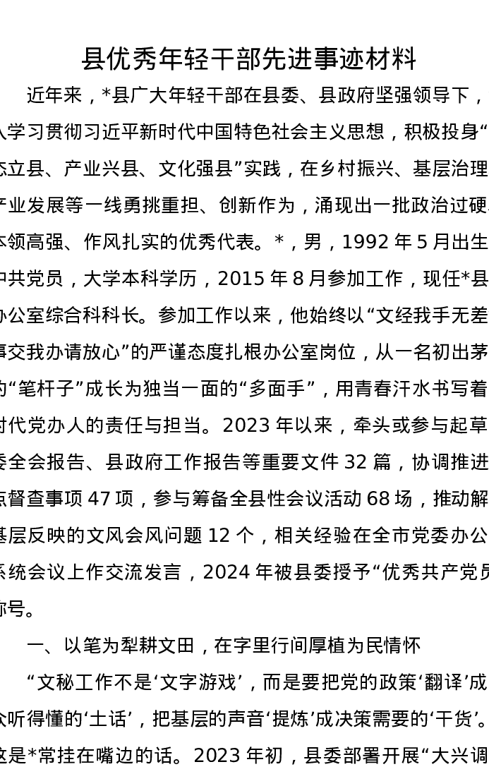 县优秀年轻干部先进事迹材料