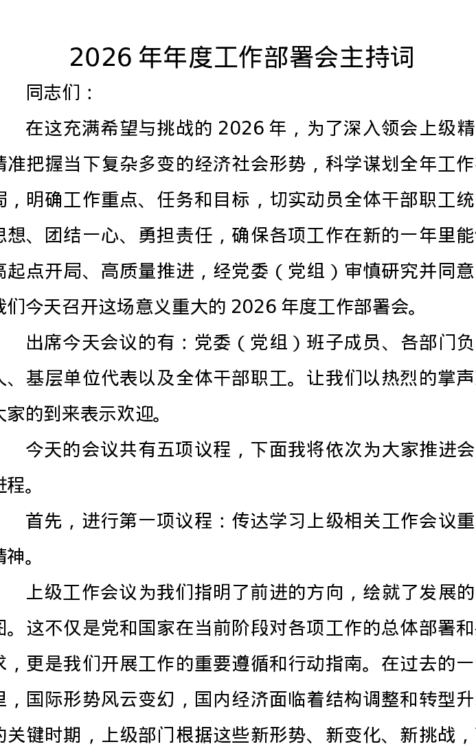2026年年度工作部署会主持词