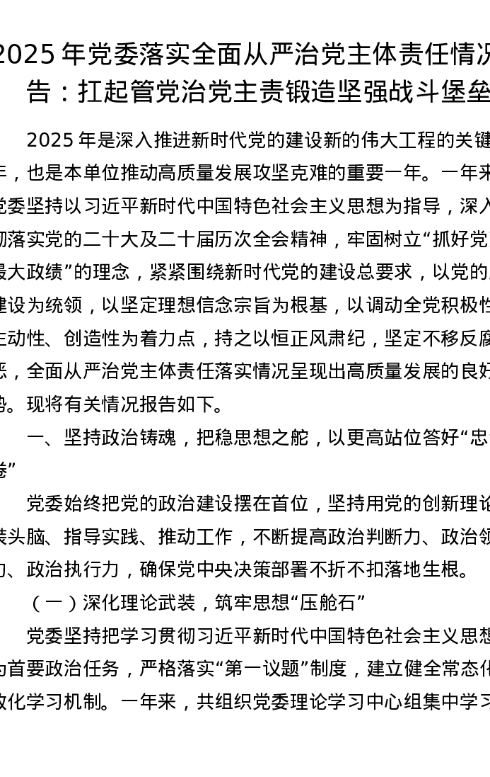 2025年党委落实全面从严治党主体责任情况报告:扛起管党治党主责 锻造坚强战斗堡垒