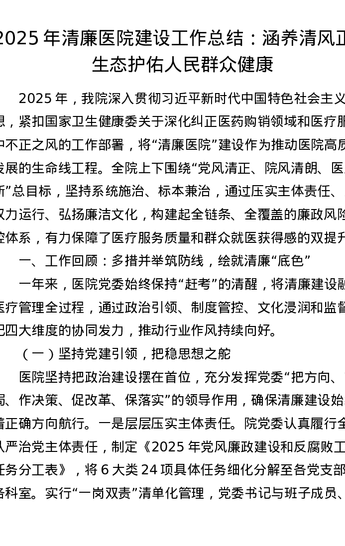 2025年清廉医院建设工作总结:涵养清风正气生态 护佑人民群众健康