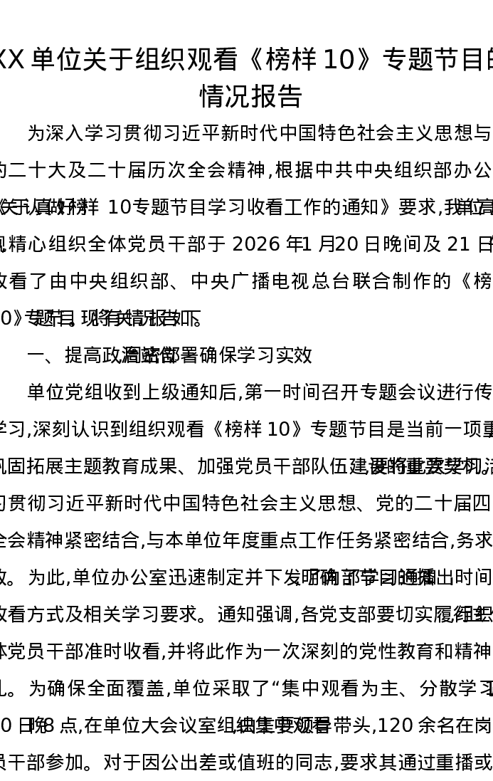 XX单位关于组织观看《榜样10》专题节目的情况报告