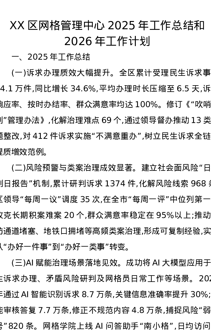 XX区网格管理中心2025年工作总结和2026年工作计划