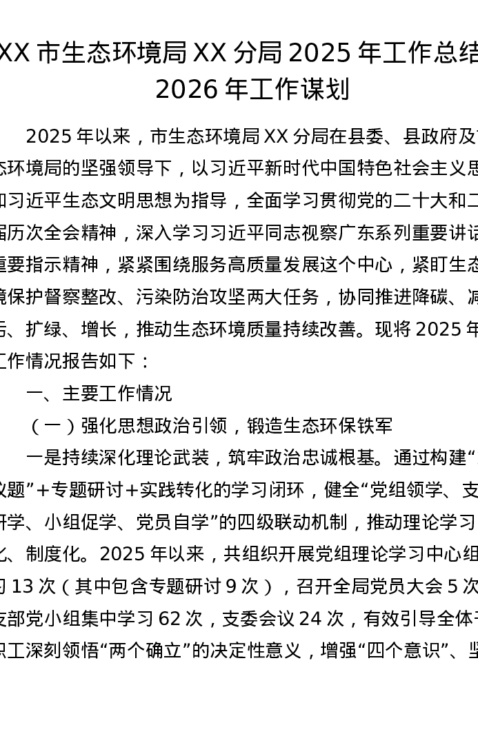 XX市生态环境局XX分局2025年工作总结和2026年工作谋划