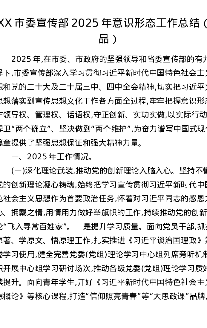 XX市委宣传部2025年意识形态工作总结