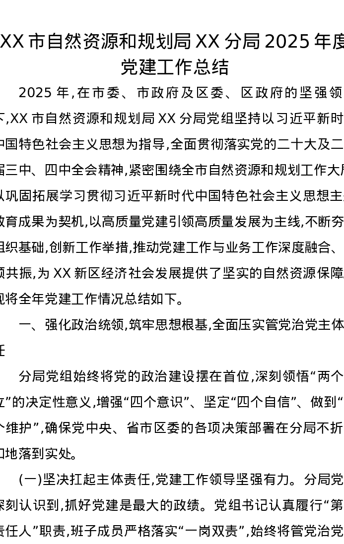 XX市自然资源和规划局XX分局2025年度党建工作总结