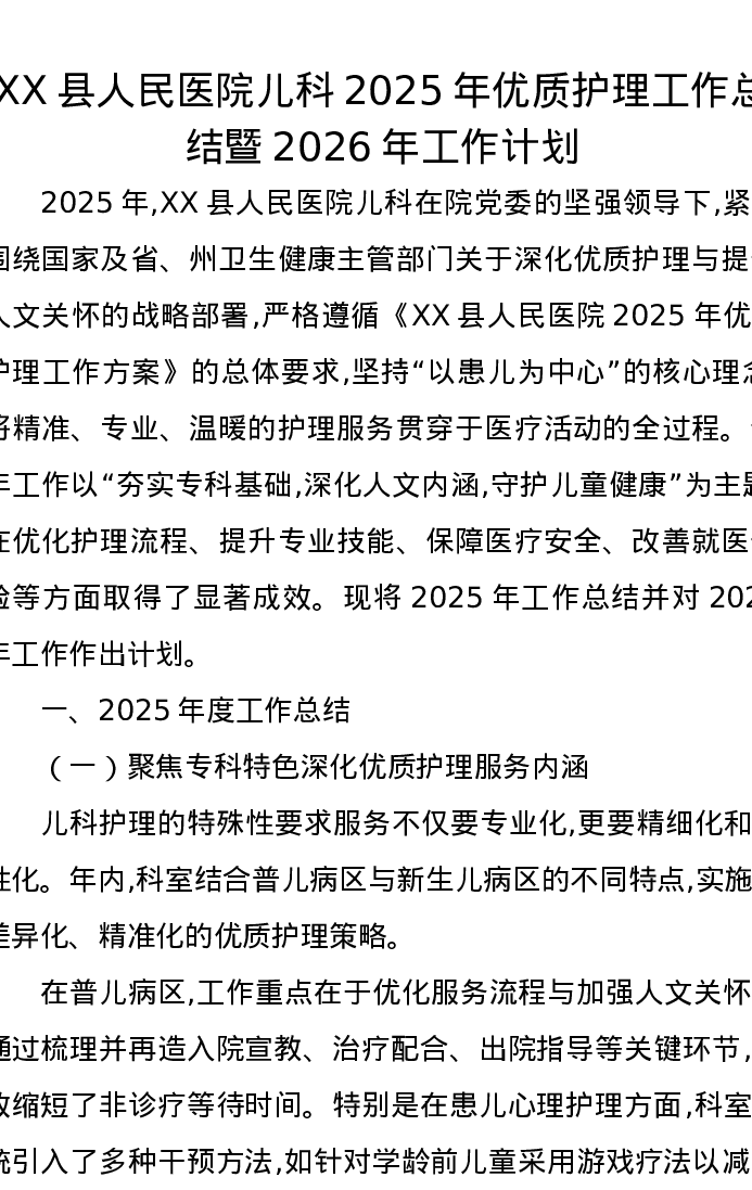 XX县人民医院儿科2025年优质护理工作总结暨2026年工作计划