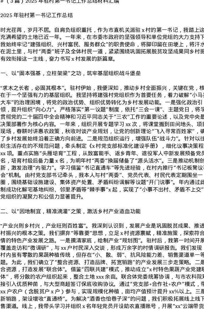汇编:2025年驻村第一书记工作总结材料汇编